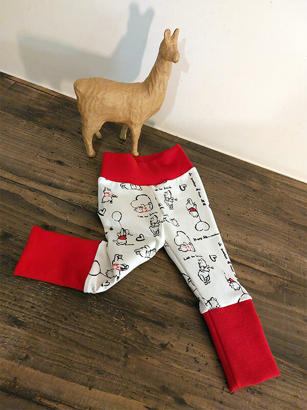 Een leuke broek met Winnie de Pooh print en rode boordjes.