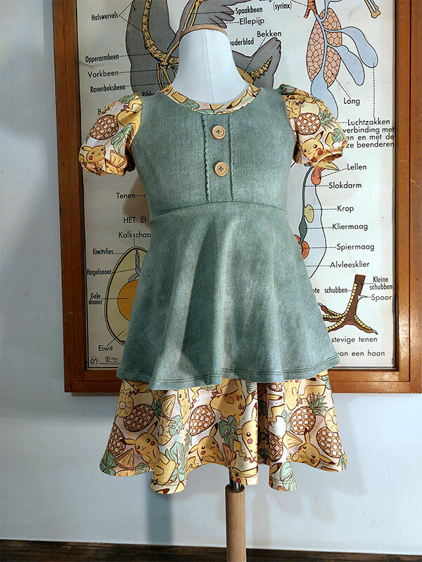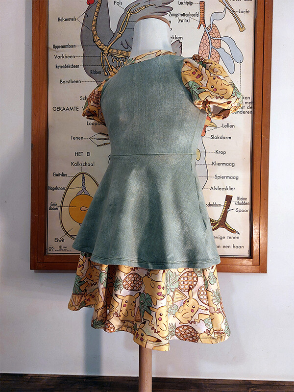 Een toffe dubbele jurk in jeanslook met Pikachu.