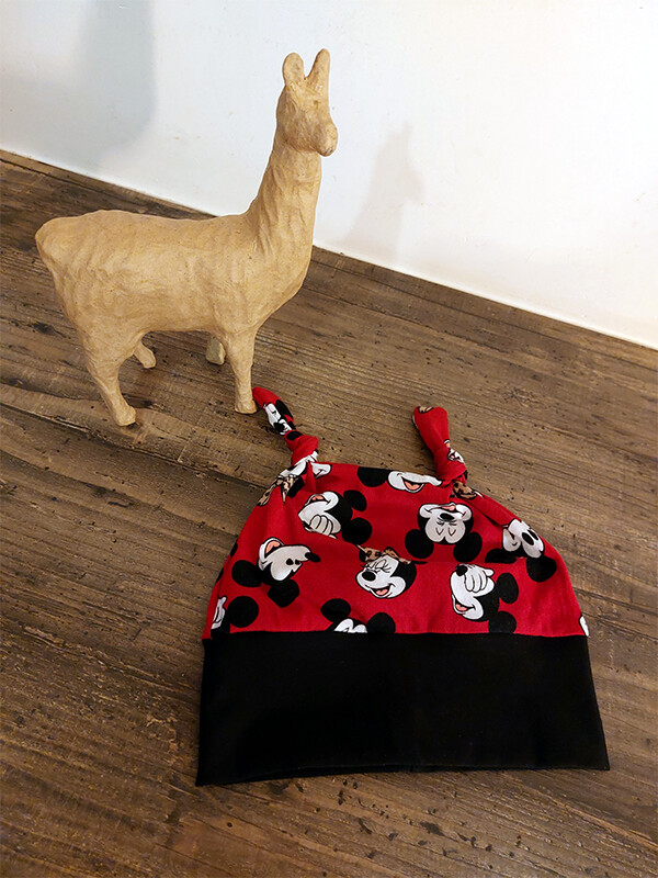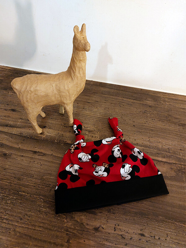 Dit schattige baby mutsje met Minnie en Mickey Mouse print is zacht en lief.