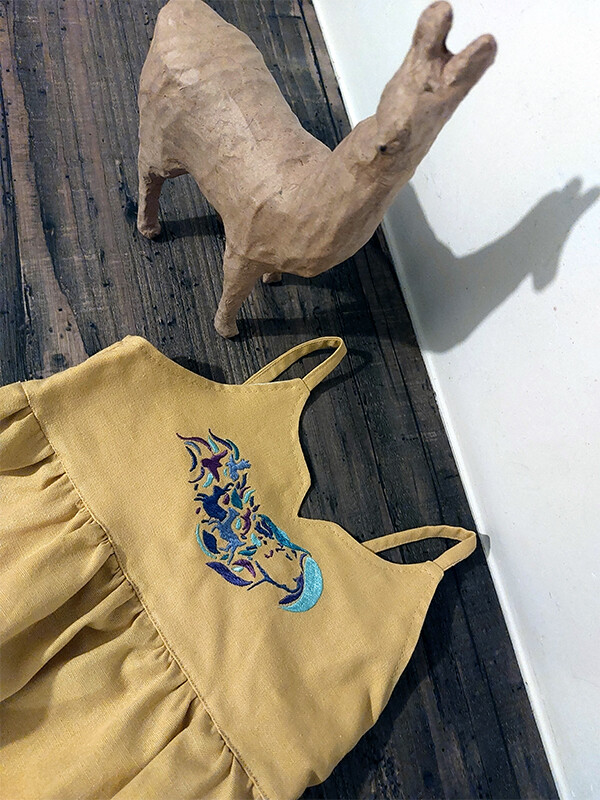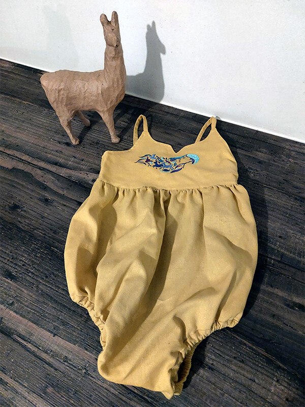 Een mooi linnen romper met Pocahontas borduursel, ideaal voor het mooie lente en zomerweer.