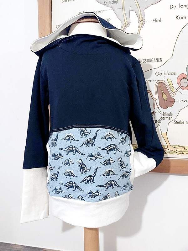 Een mooie, zachte trui met stoere dinosaurus skeletten.